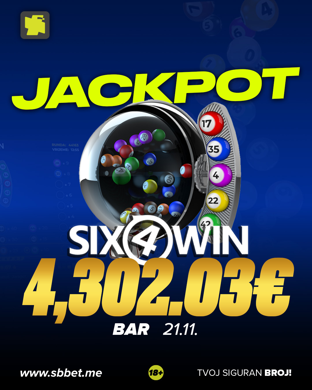 U Baru je osvojen Six4Win Jackpot – 4,302.03€ 💸💥