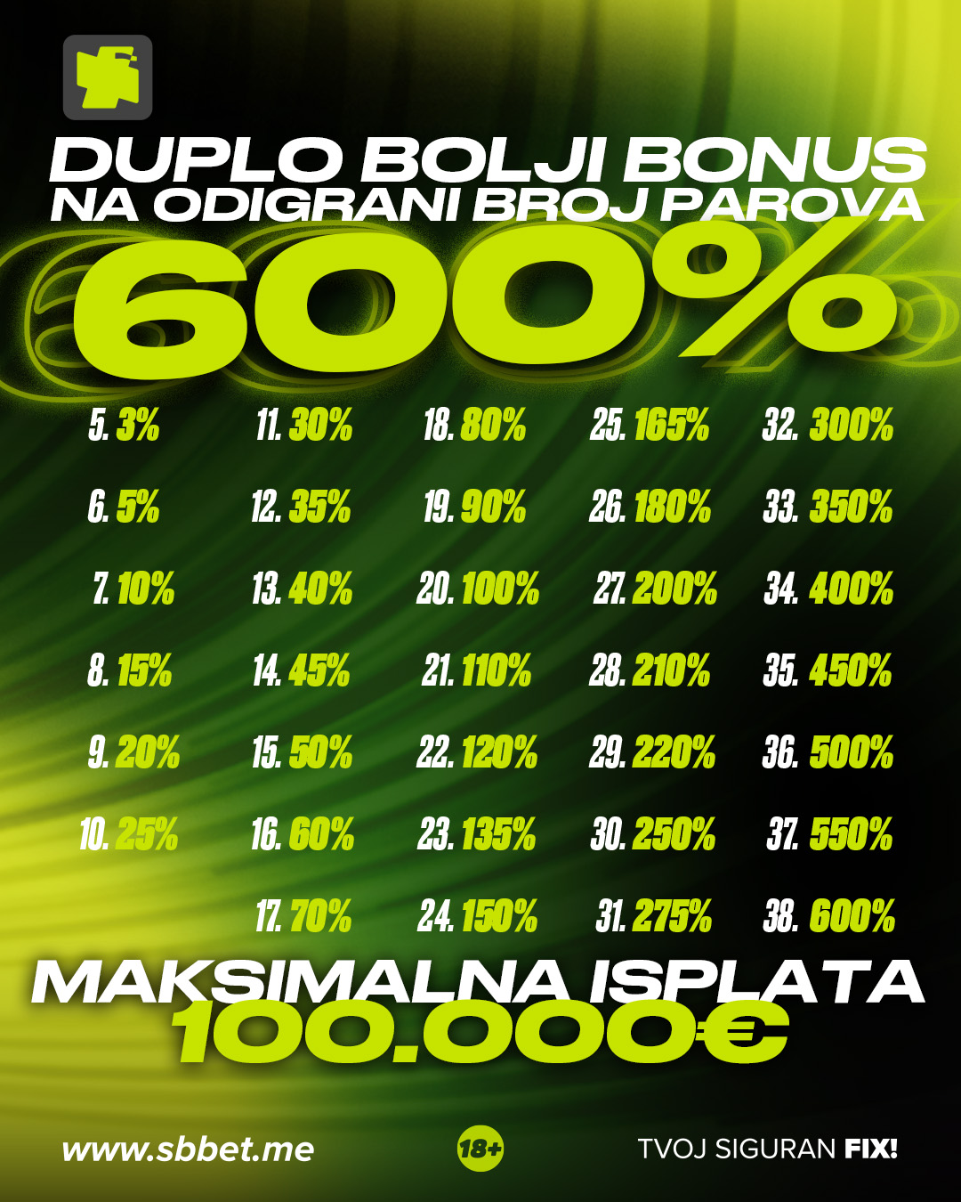 Maksimalna isplata na tiketu iznosi 100.000 sa obračunatim bonusom.